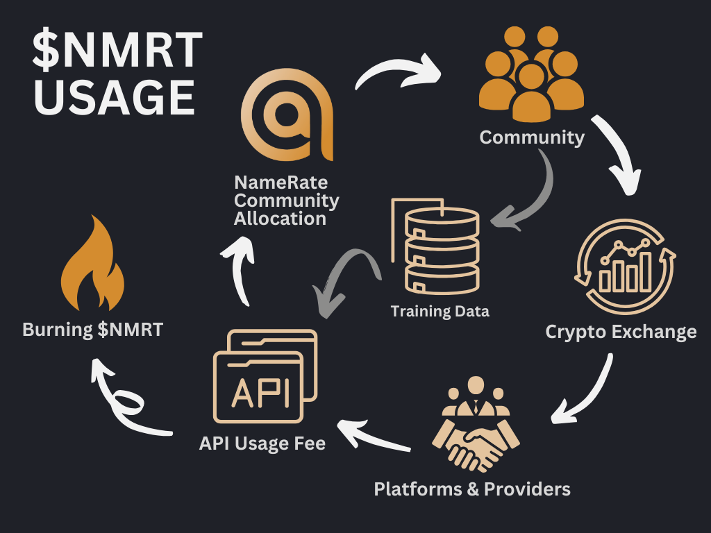 Integrations with external counterparties (TON marketplaces, the core Telegram platform, NFT traders, etc.) are implemented via the NameRate API. Any use of the API entails payment in $NMRT tokens, which market participants can purchase on the exchange. Tokens received for API usage are partially burned and partially returned to circulation as rewards for helping to validate the model.