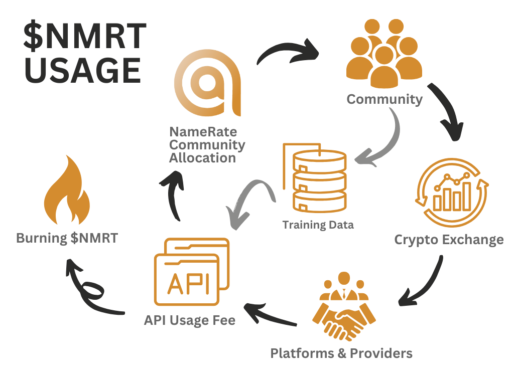 Integrations with external counterparties (TON marketplaces, the core Telegram platform, NFT traders, etc.) are implemented via the NameRate API. Any use of the API entails payment in $NMRT tokens, which market participants can purchase on the exchange. Tokens received for API usage are partially burned and partially returned to circulation as rewards for helping to validate the model.